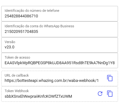 4. Retorne ao painel da Meta, clique em **Configurar Webhook** e cole as informações.