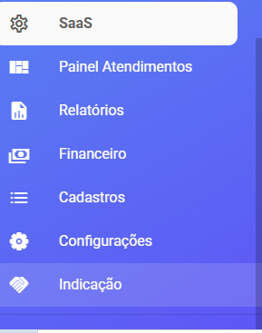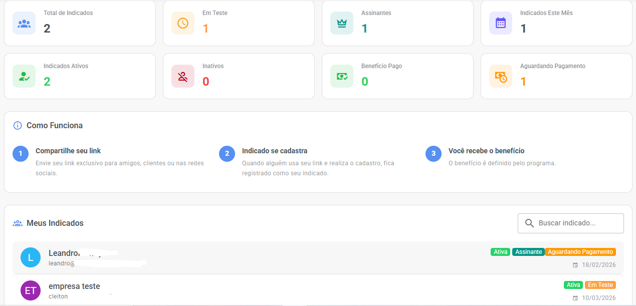 O administrador do sistema pode visualizar as indicações no painel SaaS.